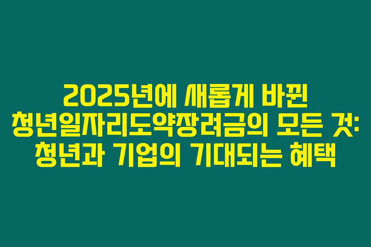 제가 알아본 바로는, 2025년 청년일자리도약장려금 제도가 취업준비생과 기업들에게 많은 변화를 가져올 것으로 기대됩니다. 이 제도는 청년들에게는 최대 480만원의 지원금을 제공하고, 기업에게는 최대 720만원을 지원하는 것이죠. 아래를 읽어보시면, 이 제도의 모든 세부사항과 신청 방법, 개선된 점들을 자세히 알아볼 수 있습니다.