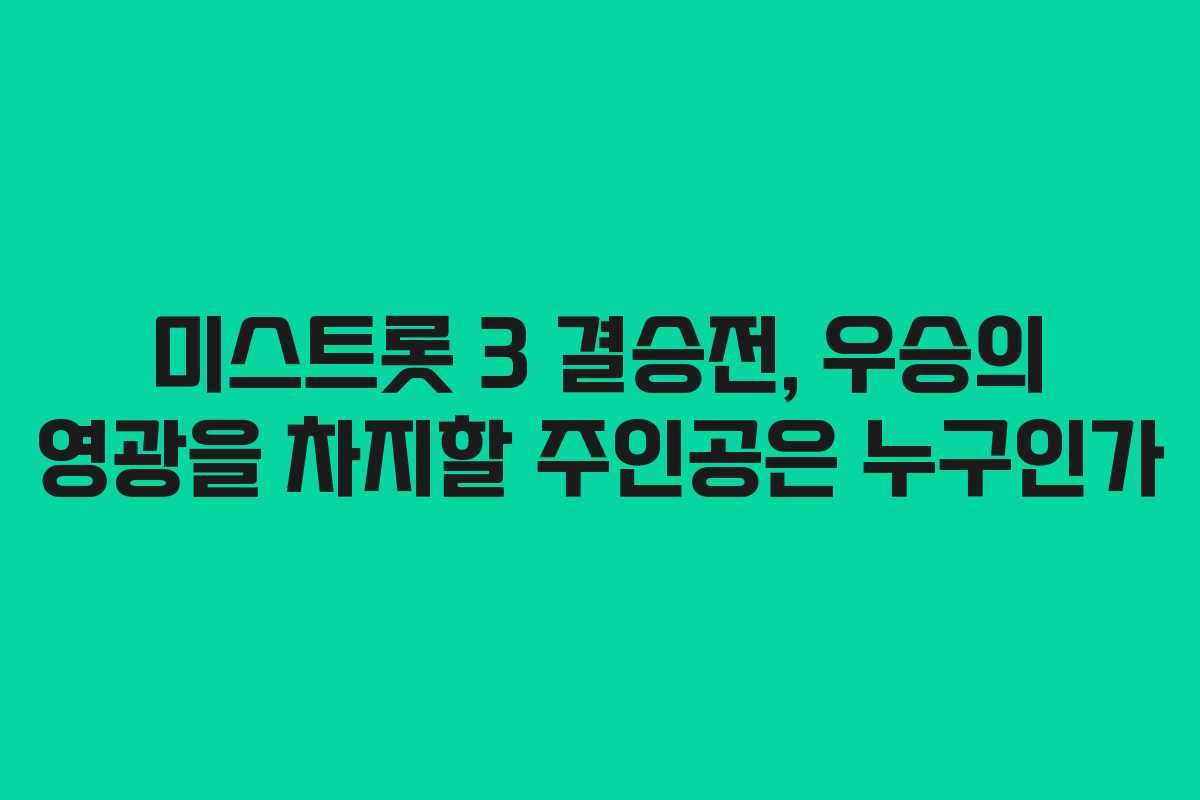 미스트롯 3의 결승전은 단순한 오디션의 끝이 아니라, 새로운 시작을 알리는 중요한 행사이다. 이번 결승전에서 우승자가 누구인지에 대한 결과는 물론, 참가자들이 걸어온 길과 그들이 보여줄 미래에 대한 기대감이 크다. 모든 참가자들이 오늘의 무대를 통해 자신을 더욱 빛내고, 많은 이들에게 감동을 줄 수 있기를 바란다.