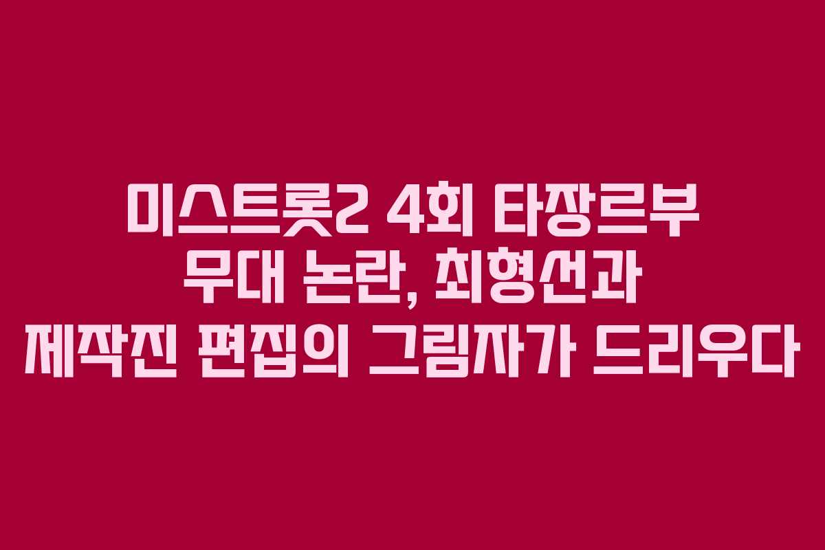 아래를 읽어보시면 미스트롯2 4회 타장르부 무대에서 벌어진 논란의 전말과 함께, 최형선의 참여 맥락, 제작진의 편집 의도에 대한 다양한 해석을 한눈에 파악할 수 있습니다. 시청자 반응의 흐름과 앞으로의 방향까지 함께 살펴보는 글입니다.