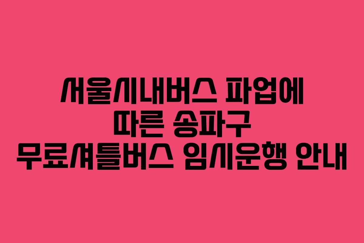 서울시내버스의 총파업으로 인해 송파구에서는 주민의 편의를 위해 무료셔틀버스를 임시 운행합니다. 이 무료셔틀버스는 주민들이 가까운 지하철역으로 이동할 수 있도록 지원하며, 파업 기간 동안 운영될 예정입니다. 운행 기간과 시간에 대한 정보는 아래에서 확인할 수 있습니다.