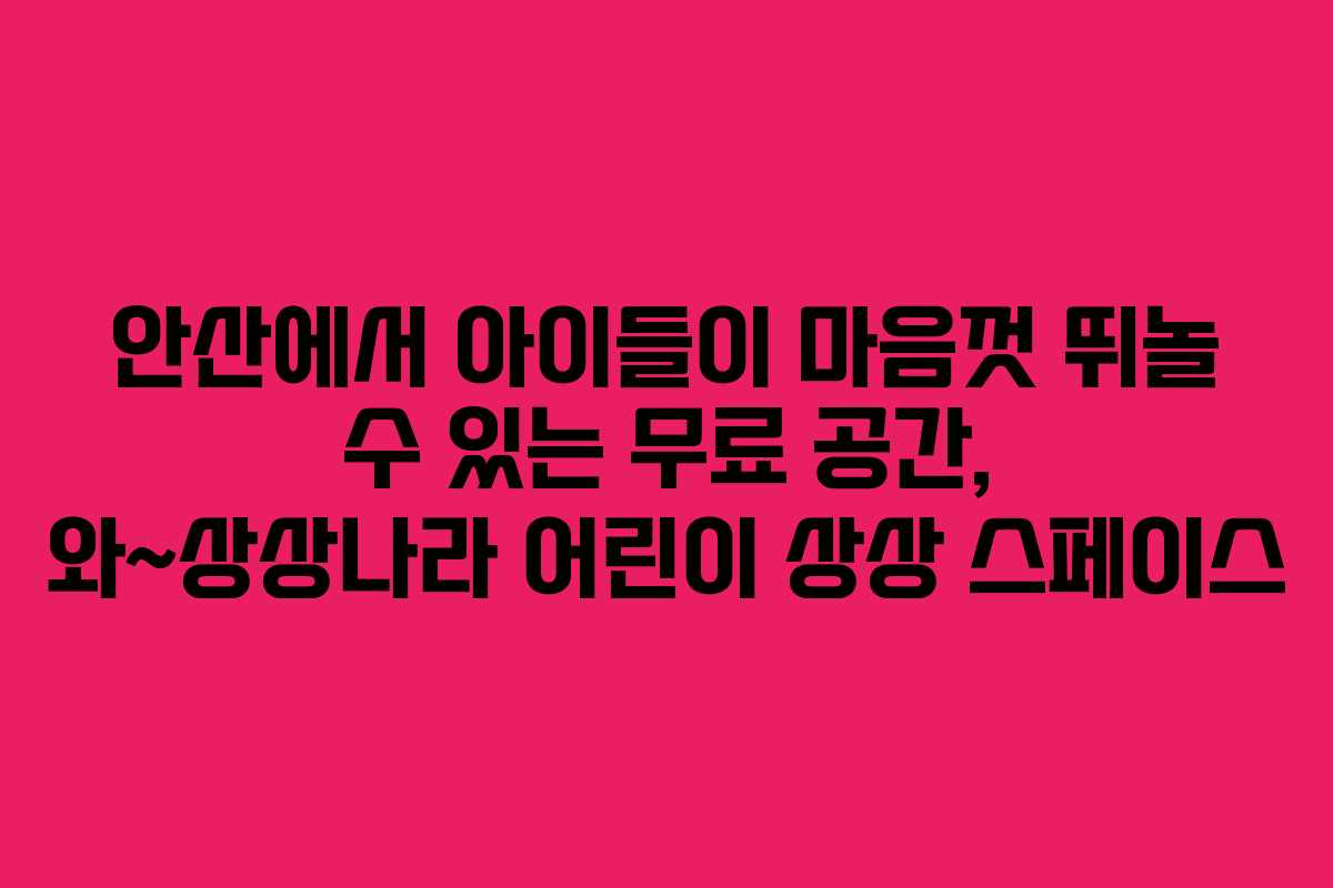 안산에는 어린이들이 실내에서 마음껏 뛰어놀 수 있는 무료 공간이 있습니다. 바로 와~상상나라 어린이 상상 스페이스입니다. 이곳은 안산 와스타디움 내에 위치해 있으며, 안산 그리너스 FC의 홈구장이기도 합니다. 상상 스페이스는 다양한 놀이시설과 안전한 환경을 제공하여 아이들이 즐겁게 시간을 보낼 수 있는 곳입니다.