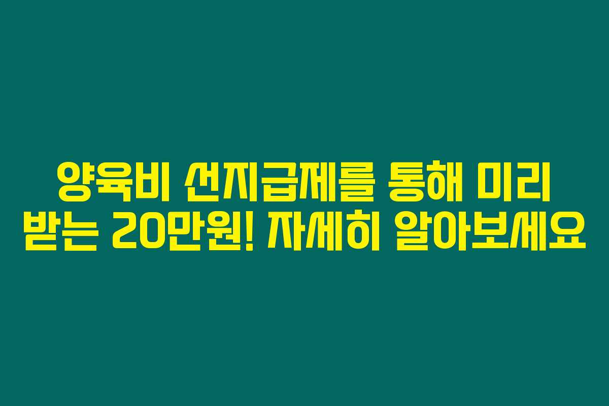 제가 직접 리서치한 바로는, 양육비 선지급제는 많은 한부모 가족에게 큰 희망이 될 수 있는 제도입니다. 이 제도는 아이를 양육하는 부모가 받지 못하는 양육비를 국가가 먼저 지급해주는 제도인데요, 특히 20만원의 선지급이 언제 이루어지는지가 많은 부모님들에게 큰 관심사입니다. 아래를 읽어보시면 이 제도에 대해 더욱 자세히 알아보실 수 있을 겁니다.