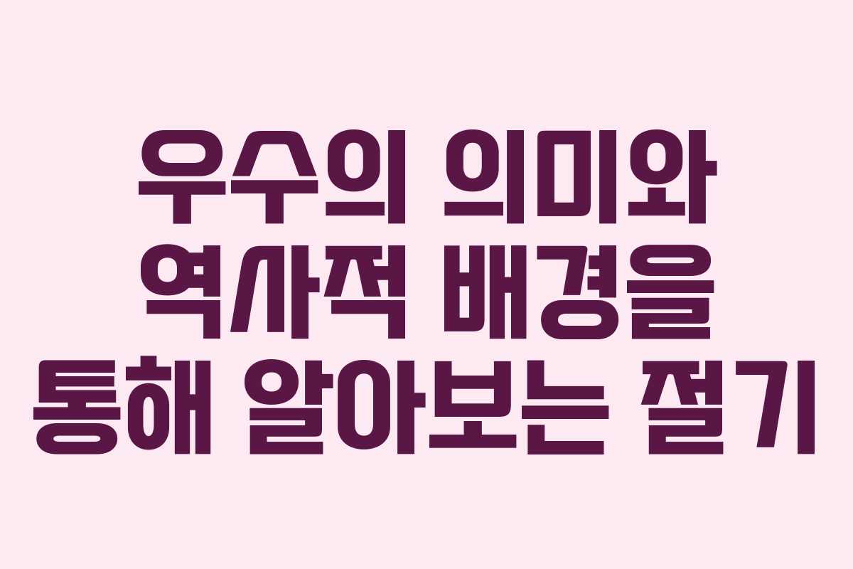 우수는 24절기 중 하나로, 입춘과 경칩 사이에 위치한 절기입니다. 이 시기에 들어서면 날씨가 따뜻해지고, 얼음이 녹아 물이 흐르며, 생명력이 돋아나는 시기를 맞이하게 됩니다. 이러한 변화는 농업과 자연환경에 큰 영향을 미치며, 과거의 풍습과 문헌에서도 그 중요성을 엿볼 수 있습니다.