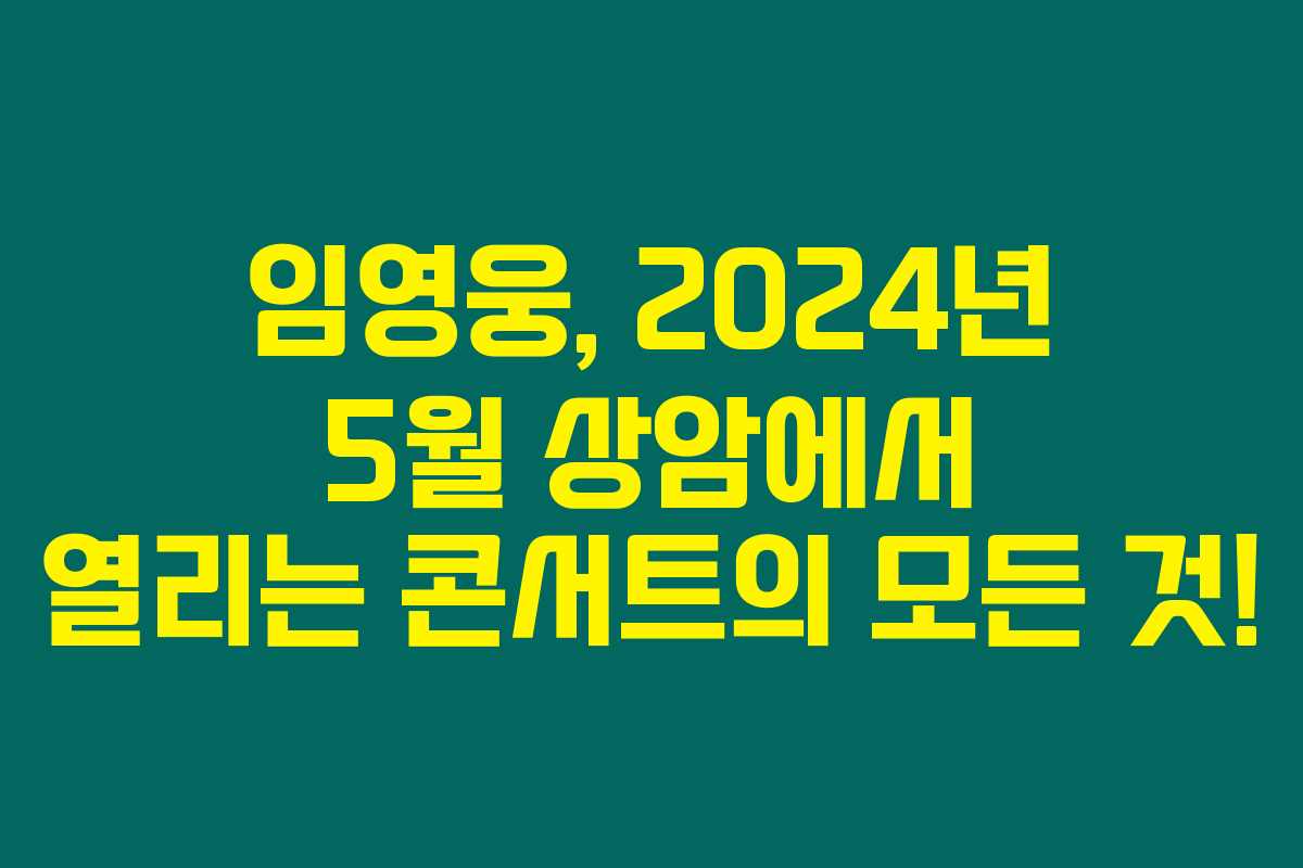 2024년 5월, 임영웅이 서울 상암동에서 단독 콘서트를 개최합니다. 주제는 ‘2024 IM HERO THE STADIUM CONCERT’로, 날짜는 5월 25일과 26일 이틀 동안 진행됩니다. 그의 뮤직과 팬들에게 보내는 메시지로 가득 찬 콘서트를 기대해보세요!