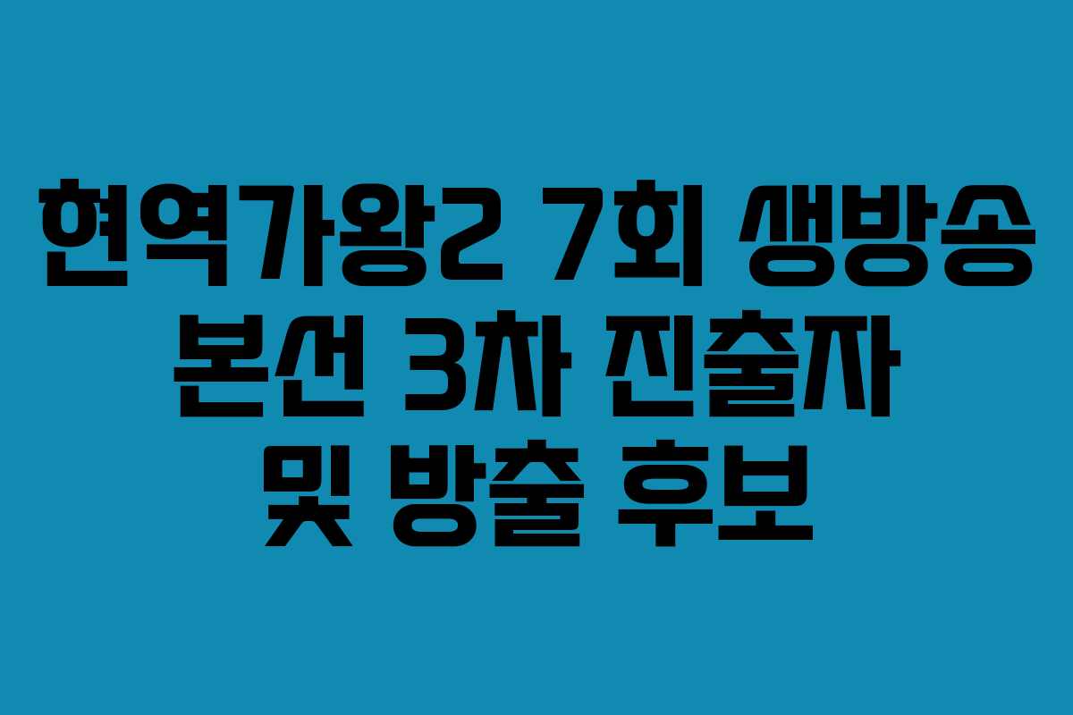 2025년 1월 14일 방송된 현역가왕2 7회에서는 본선 3차전 진출자와 방출 후보가 발표되었습니다. 이번 방송에서는 팀 미션의 결과로 인해 방출 후보가 20명까지 늘어나 긴장감이 감돌았습니다. 이제 참가자들은 동료가 아닌 경쟁자로서의 관계로 돌아가게 되며, TOP7 진출을 위한 치열한 경쟁이 진행됩니다.