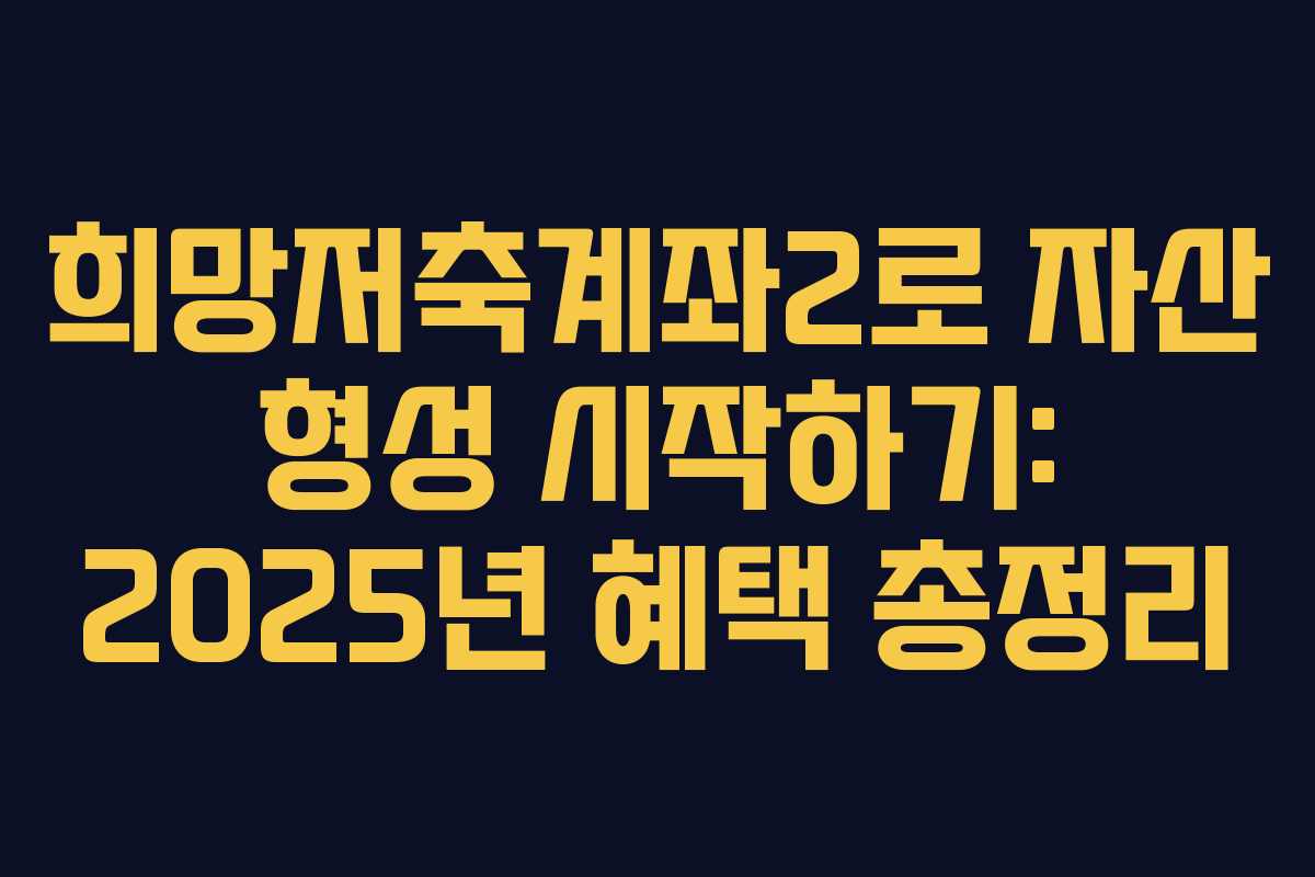 희망저축계좌2는 저소득 근로 가구의 자산 형성을 돕기 위한 정부 지원 제도입니다. 매달 일정 금액을 저축하면 정부가 추가 금액을 매칭해주는 방식으로 자산을 키우는 것을 목표로 합니다.